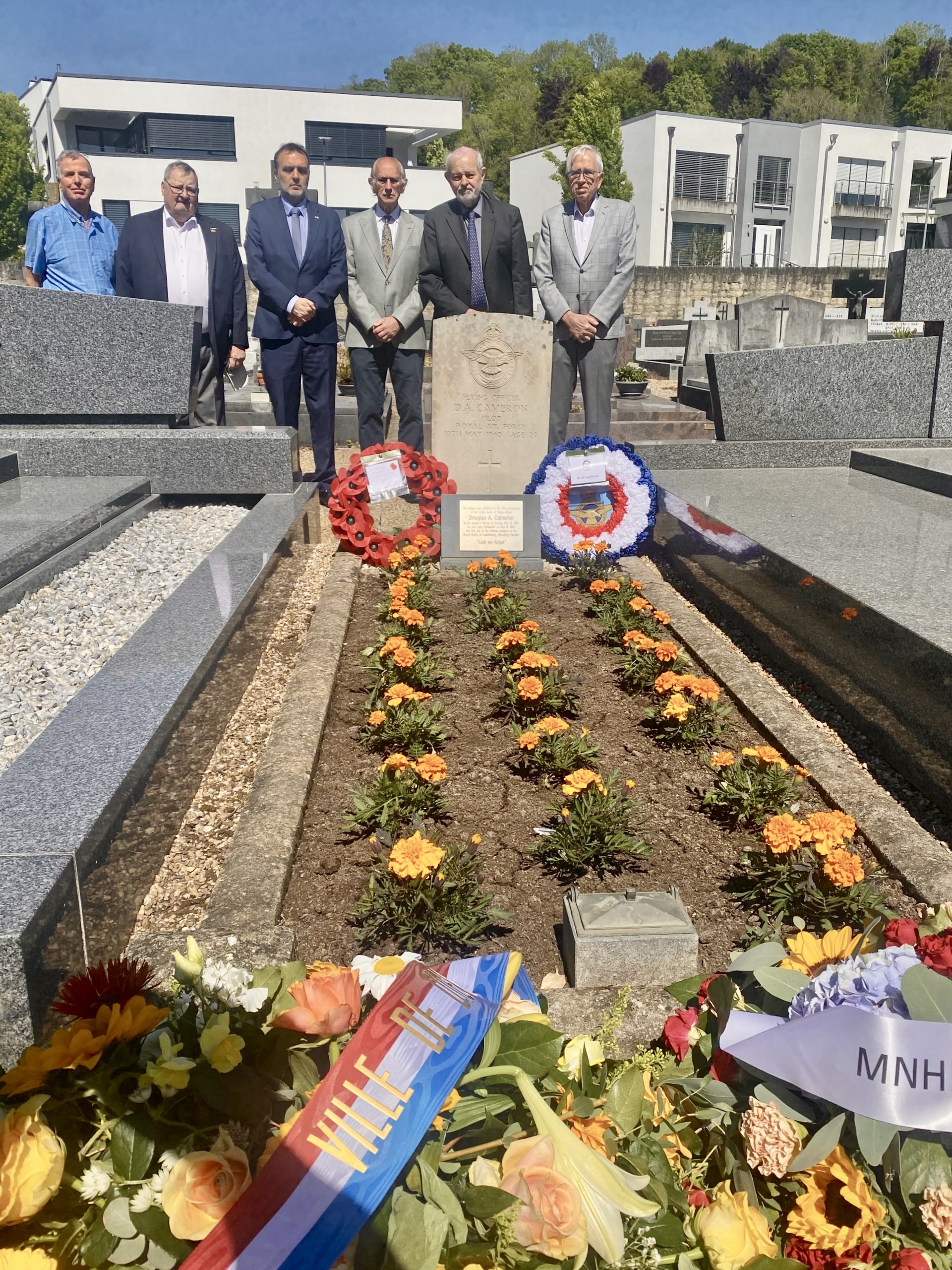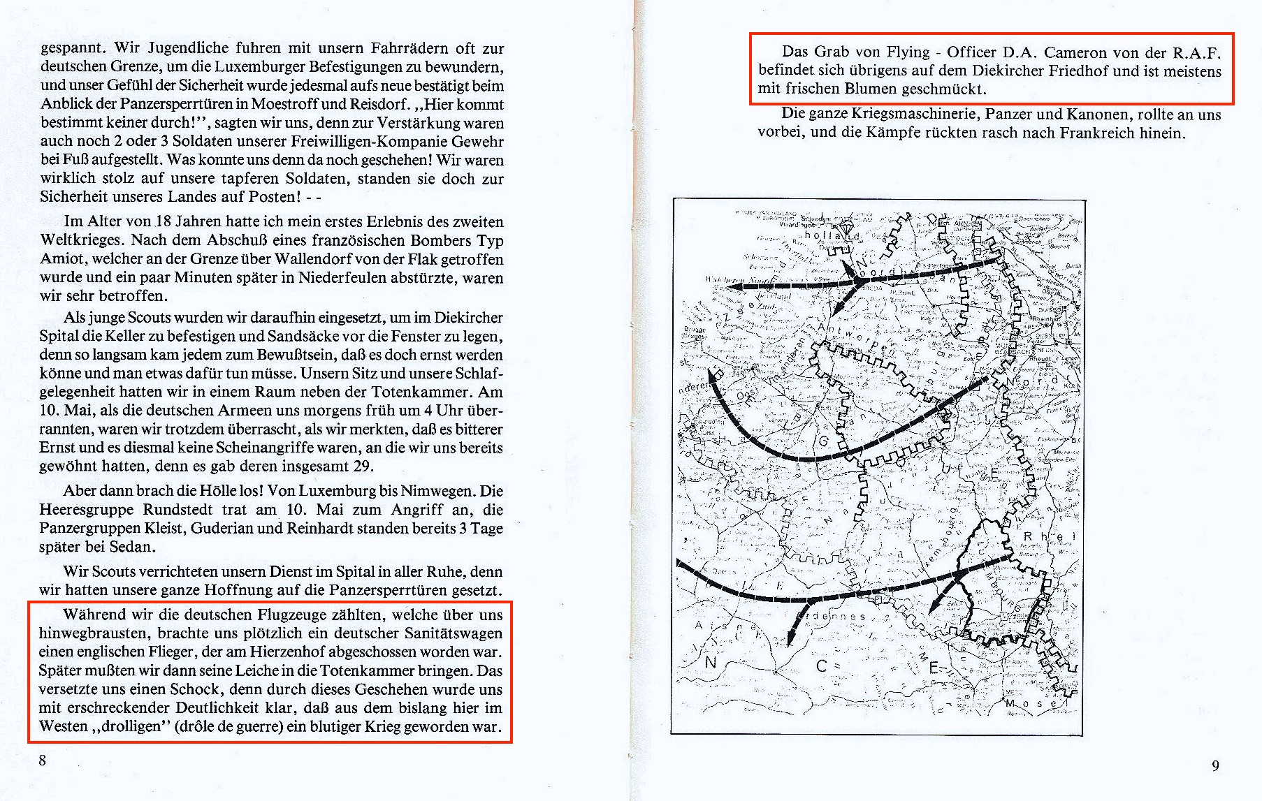 … le Fairey Battle était un bombardier-chasseur britannique peu performant et très vulnérable: il était lent, insuffisamment armé et dépourvu de cockpit blindé. Et pourtant, sur ordre de l’Air Chief Marshal Sir Arthur Sheridan BARRATT (1891, +1966), trente-deux Fairey Battle de la Royal Air Force participaient à un raid aérien lancé le 10 mai 1940 depuis la base aérienne de Reims contre l’envahisseur allemand qui avançait à pas de géant en terre occupée. Le Fairey Battle de FO (Flying Officer) Douglas Alexander CAMERON fut gravement touché par la FLAK (Flugabwehrkanone, défense anti-aérienne allemande) dans les environs de Wallendorf et dut se poser en catastrophe près du Hierzenhaff sur les hauteurs de Bettendorf. Le Sgt (Sergeant) C. S. HART et l’AC1 (Aircraftman 1st class) J. G. WARD arrivèrent à s’extraire de l’appareil en feu avec quelques égratignures et des contusions. Le pilote avait moins de fortune: gravement touché au bras droit, il décéda le jour même vers 23 heures à la Clinique du Sacré-Cœur de Diekirch où le Dr Georges TANDEL (*1910, +1968) l’avait pris en charge. Désormais, 16.500 km séparent la dernière demeure de Douglas Alexander CAMERON (*1915, +1940) au cimetière de Diekirch de sa terre natale: l’Australie. Depuis la fin de la guerre, Valérie WINTER-GEORGES (*1911, +2006), puis John « Boy » NEVEN (*1949, +2006) et enfin le staff du Musée National d’Histoire Militaire (MNHM), sous la houlette du curateur Roland GAUL, se sont dévoués et se dévouent à entretenir et fleurir la tombe du FO Doug A. CAMERON au cimetière de Diekirch. (English version) (bp, fg, rg, bn, 2014-10-13)