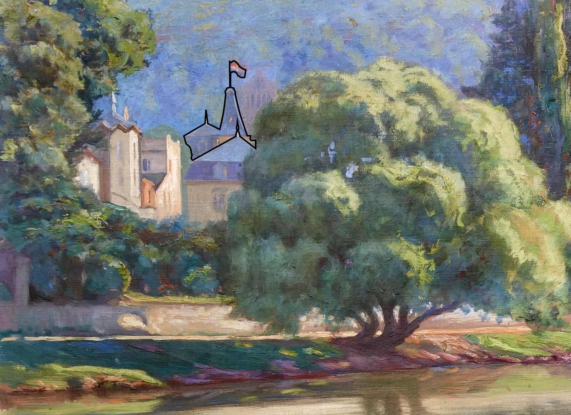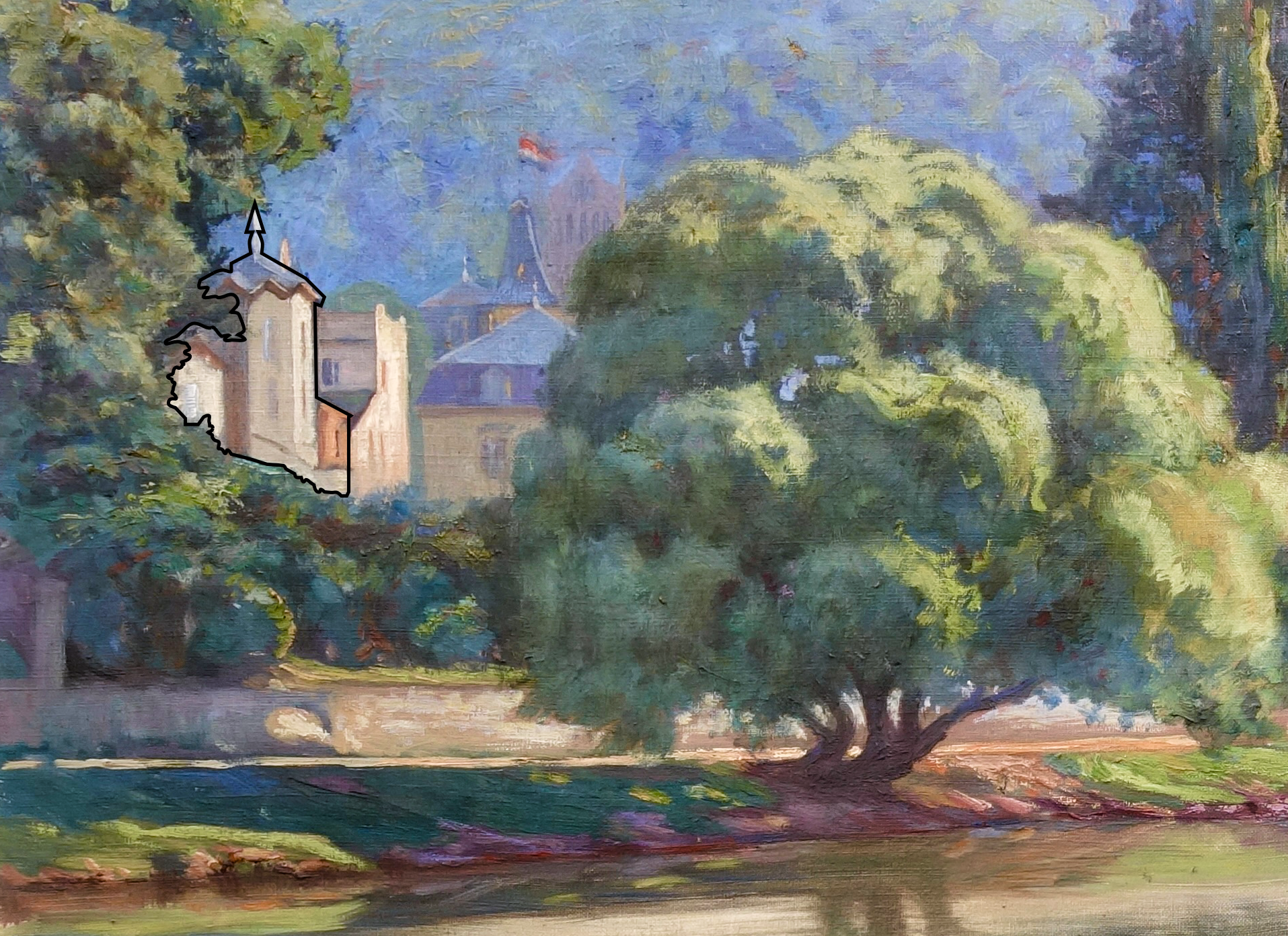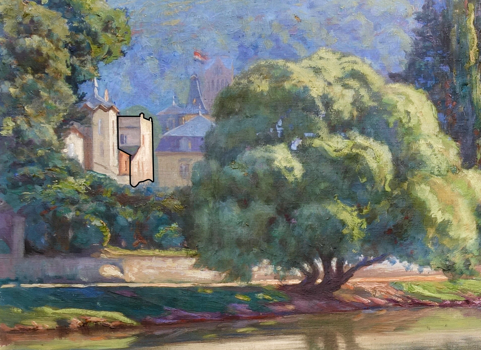 Détail de la peinture à l’huile de Joseph OTH, 94 x 70 cm, de 1918, représentant les immeubles de la rue Alexis HECK, enfilés dans une perspective orientée du sud au nord. De gauche à droite et de haut en bas on découvre les silhouettes délimitées par un filet noir de la maison GLAESENR, BOEVER et LOUTZ, la maison MONGENAST-GRADWOHL, les quartiers privés d’Alexis HECK, le Grand Hôtel des Ardennes, l’immeuble gothique de la pente du Herrenberg (château d’eau de l’Hôtel des Ardennes?) et les cinq silhouettes réunies. [Peinture à l’huile par Joseph OTH_1918; photographies, cadrage et sihouettage: bp_2025]