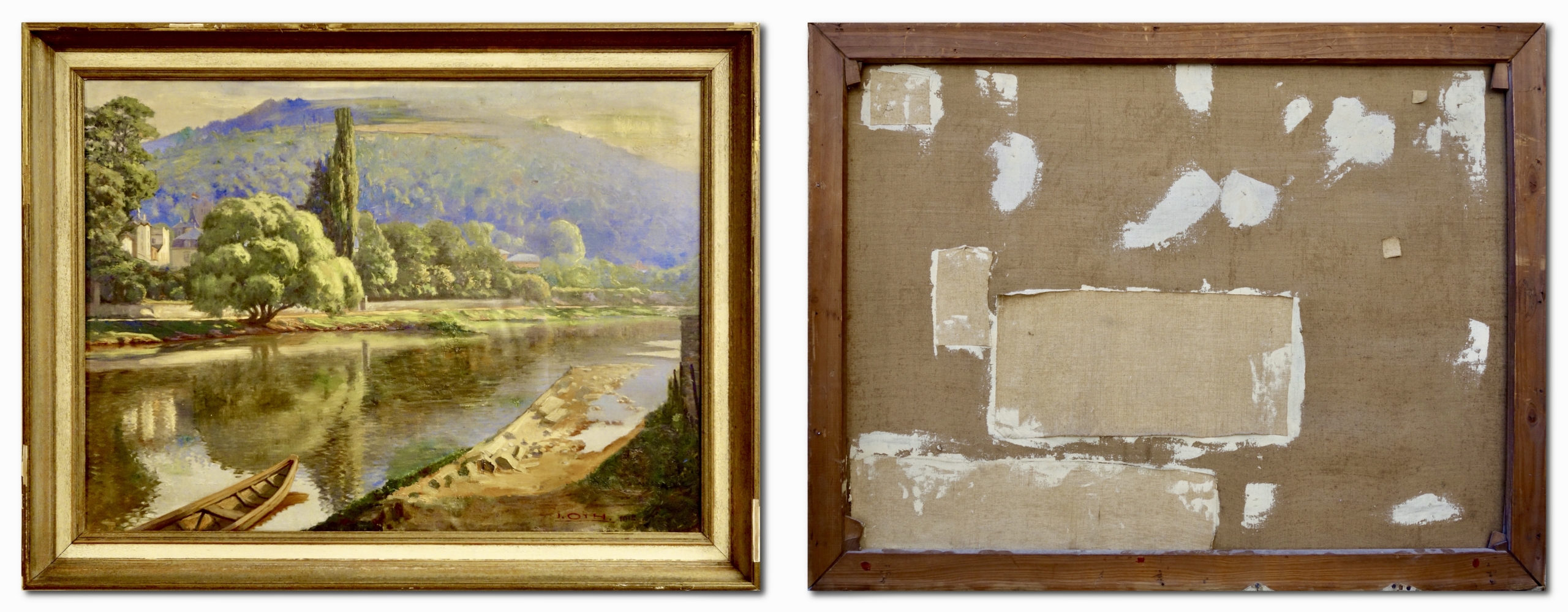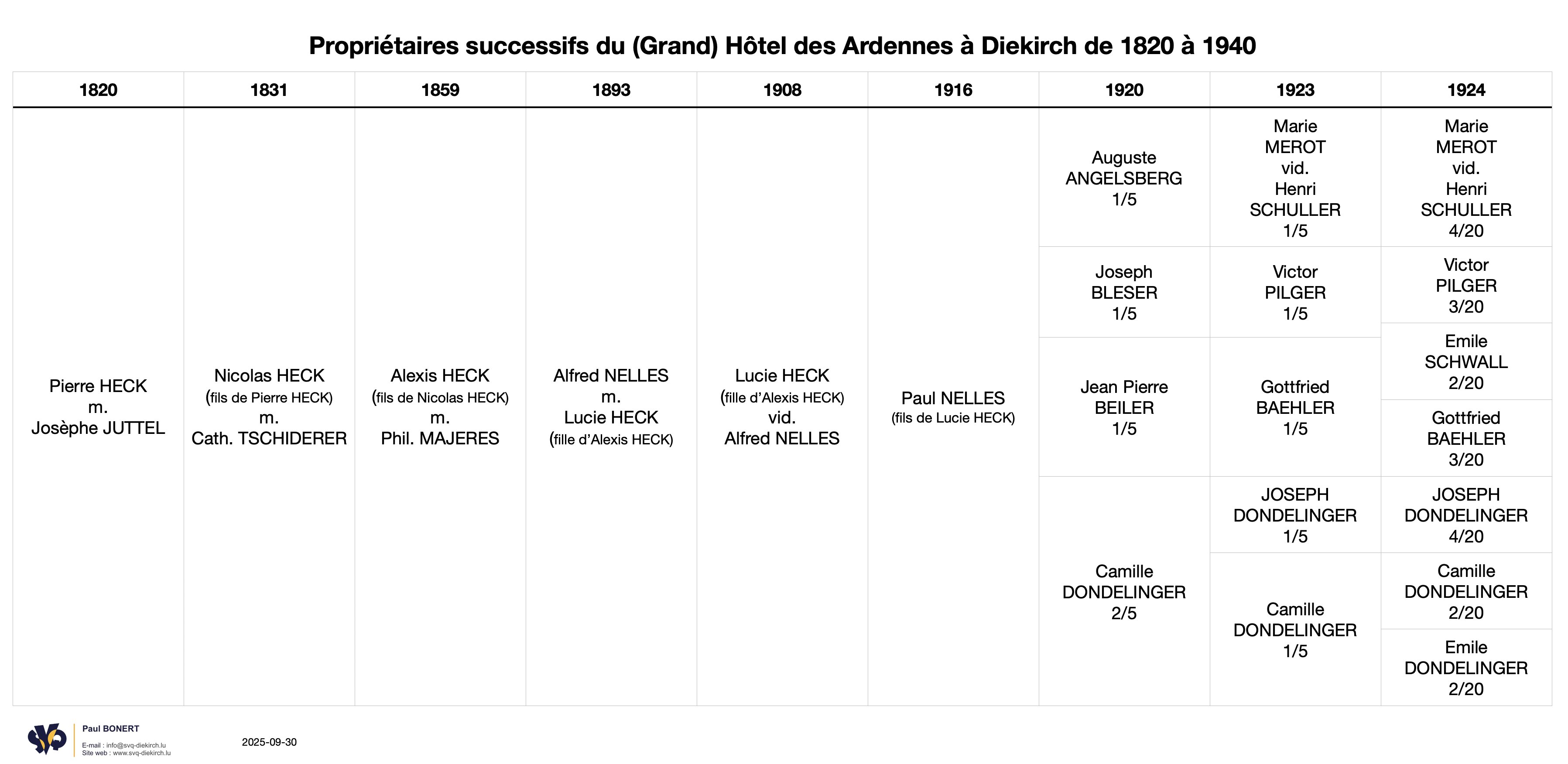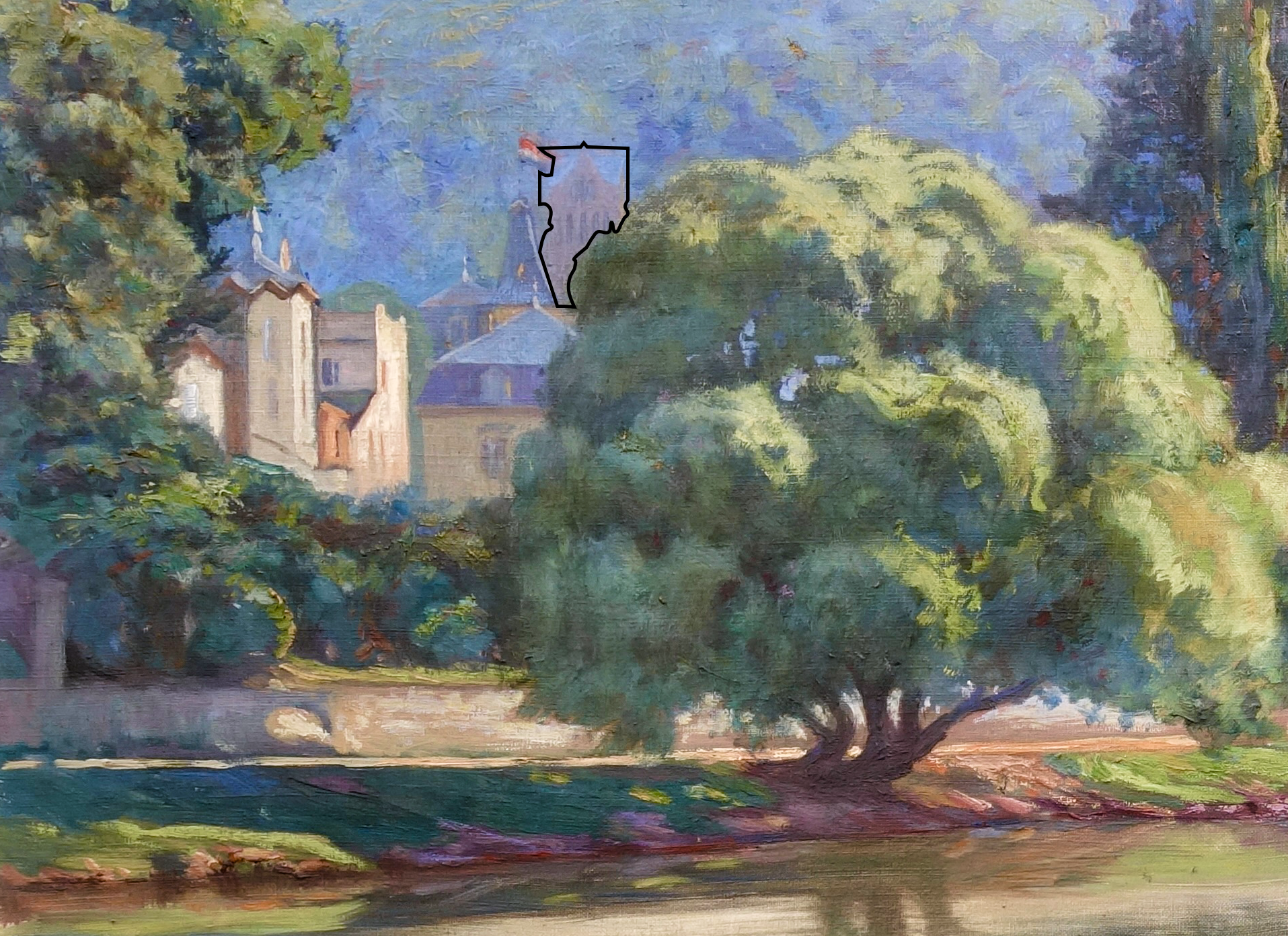 Détail de la peinture à l’huile de Joseph OTH, 94 x 70 cm, de 1918, représentant les immeubles de la rue Alexis HECK, enfilés dans une perspective orientée du sud au nord. De gauche à droite et de haut en bas on découvre les silhouettes délimitées par un filet noir de la maison GLAESENR, BOEVER et LOUTZ, la maison MONGENAST-GRADWOHL, les quartiers privés d’Alexis HECK, le Grand Hôtel des Ardennes, l’immeuble gothique de la pente du Herrenberg (château d’eau de l’Hôtel des Ardennes?) et les cinq silhouettes réunies. [Peinture à l’huile par Joseph OTH_1918; photographies, cadrage et sihouettage: bp_2025]