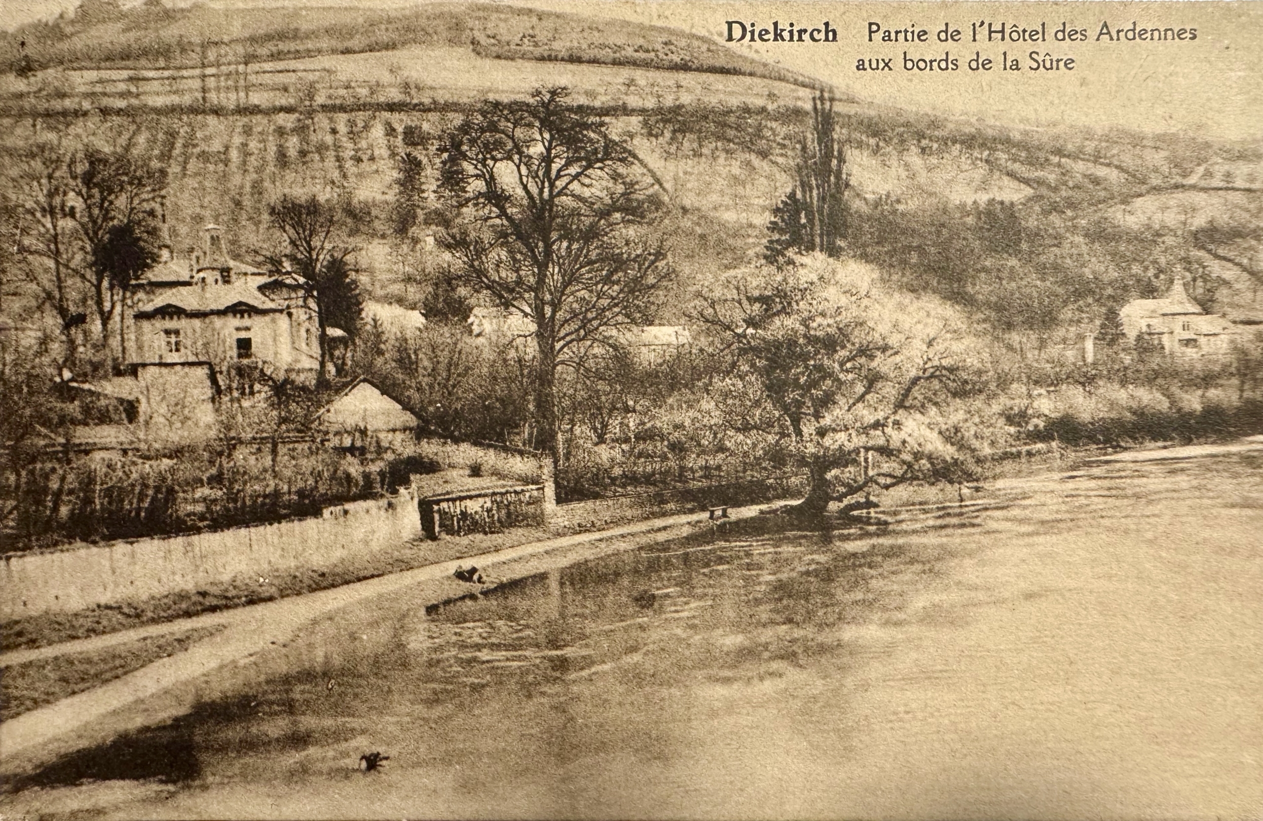 Vue de la rive gauche de la Sûre à Diekirch. Le deuxième bâtiment à partir de la gauche fût occupé successivement par le Dr Jean Pierre GLAESENER, le Dr Jean BOEVER et finalement le Dr Jean LOUTZ. À gauche du clocher de la Vieille Église se dessinent les quartiers privés d’Alexis HECK, actuelle Villa CONTER, futures Archives communales. L’imposant Hôtel des Ardennes se trouve à droite dudit clocher. En contrebas du chemin longeant le bord de la Sûre, fréquenté par quelques promeneurs endimanchés, se trouvent les cabines-vestiaires des bains de rivière de l’Hôtel des Ardennes. Le message manuscrit en bas de la carte postale datant du 17 octobre 1902 est rédigé en SÜTTERLIN et se lit: Von hier aus einen kleinen Beitrag zu Ihrer Sammlung nebst bestem Gruß M. Hartmann. Quant à l’expéditeur, il pourrait s’agir de Marie Thérèse HARTMANN (*1858, +1923), fille d’Antoine HARTMANN (*1817, +1891) et épouse de l’avocat Mathias GLAESENER (*1858, +1924), fils du Dr Jean Pierre GLAESENER (*1831, +1901). [Photographie: Th. MANNON, Diekirch]