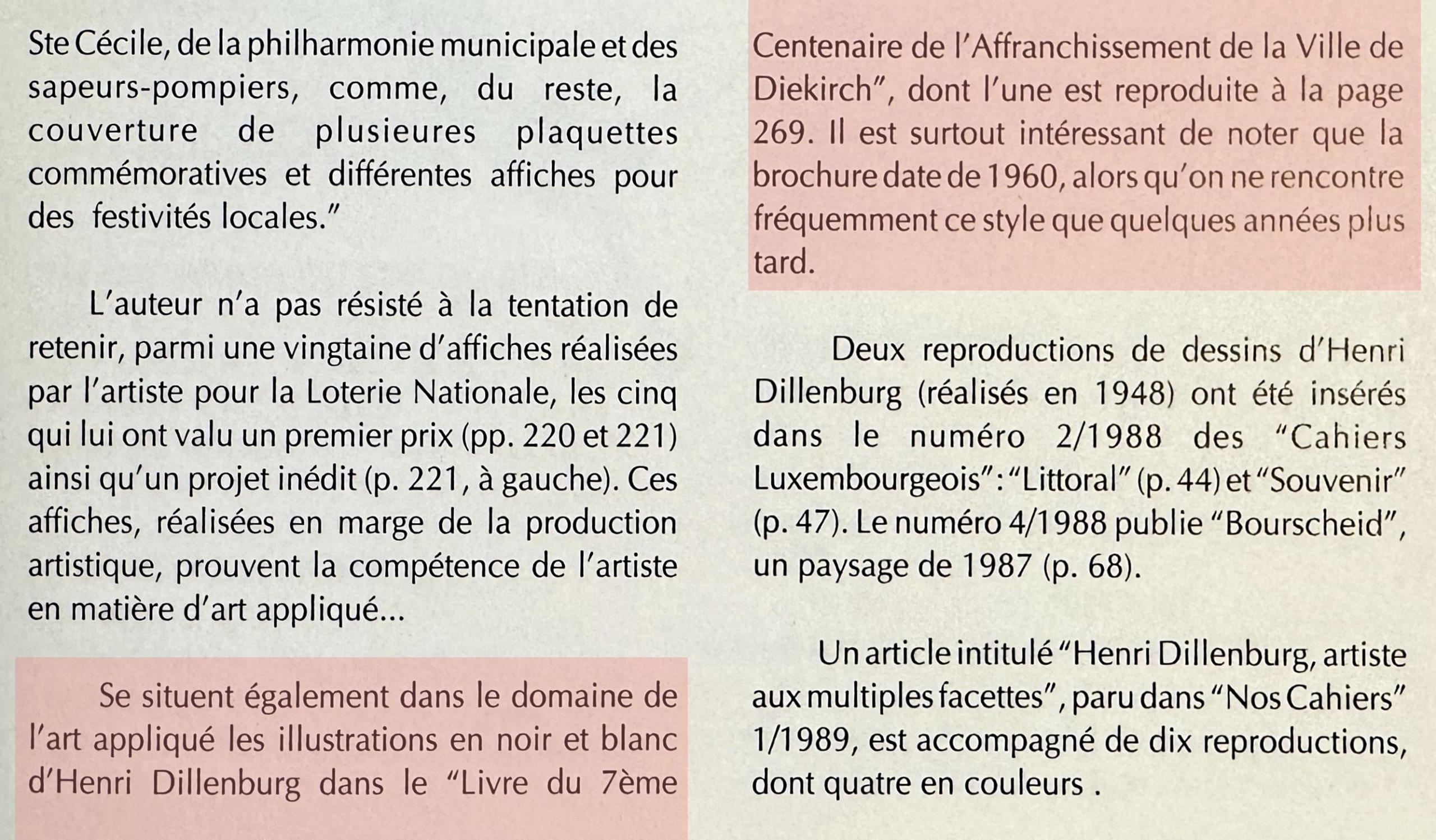 De gauche à droite, DIEKIRCH G de 1982, 46 x 50 cm, huile et collage sur carton, DIEKIRCH 9-1 de 1985, 65 x 50 cm, huile sur papier, DIEKIRCH 24-1 (NAELCHESWÉ) de 1986, 65 x 50 cm, huile sur papier et DIEKIRCH PHA-1 de 1986, 102 x 99 cm, huile sur toile, autant de « paysages inclinés » de la Ville de Diekirch. [Images: T. LAMMAR: L’Aventure picturale d’Henri DILLENBURG, 1989, p. 198, 204, 205 et 208; scan et assemblage: bp_2024]